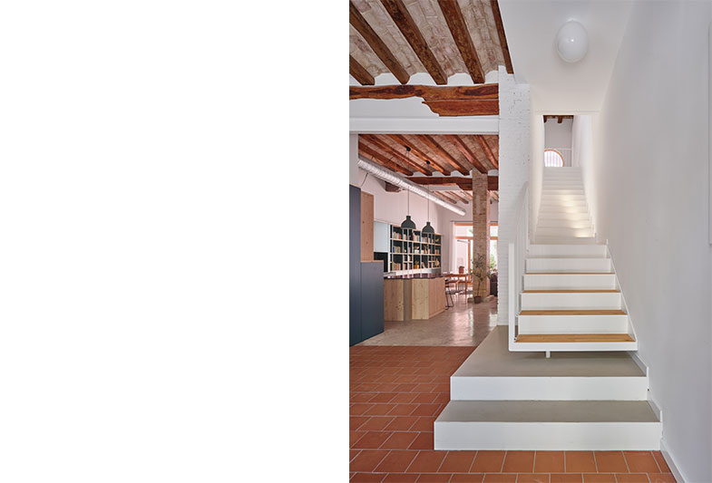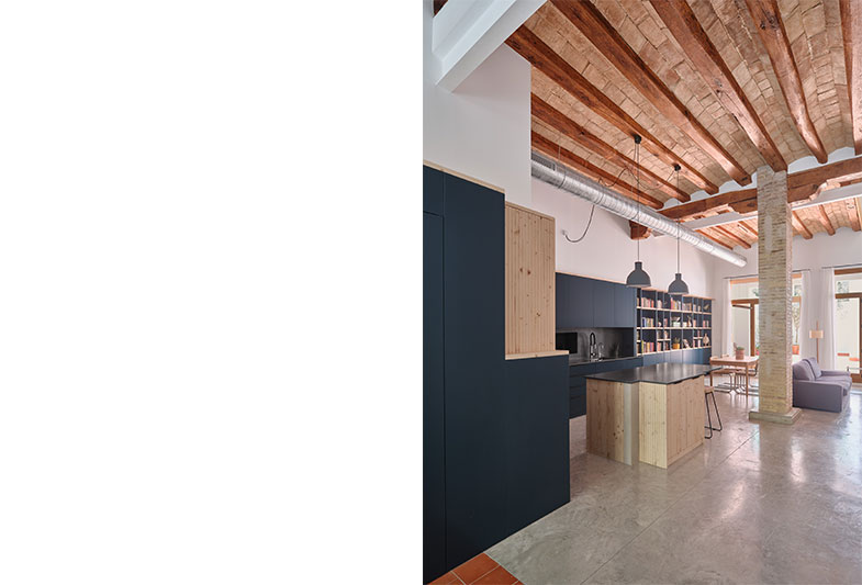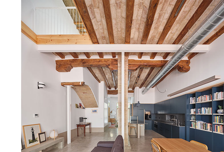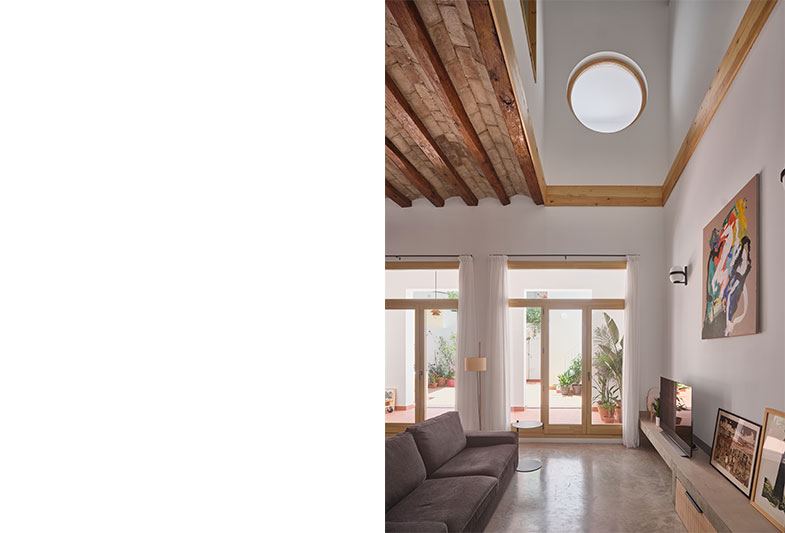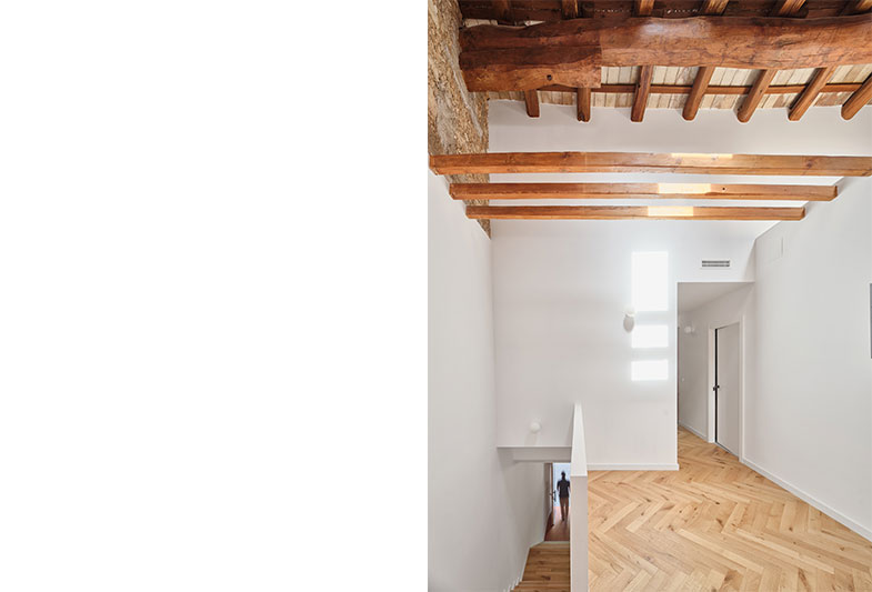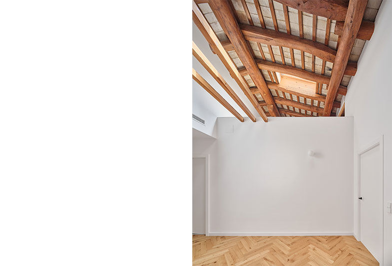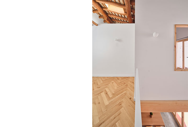La transformació d’aquest habitatge comença per la teulada. Parteix de la idea de mostrar un element constructiu amagat, la coberta existent i els seus elements estructurals.